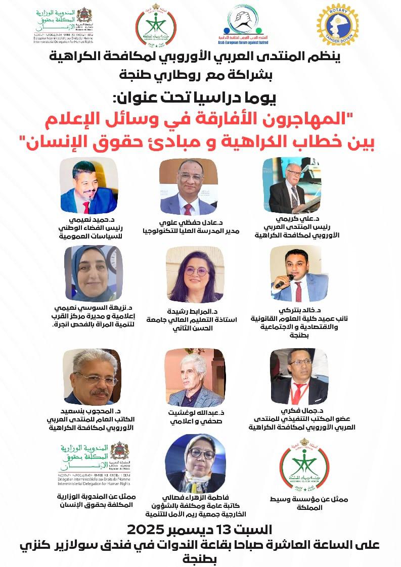 ينظم المنتدى العربي الأوروبي لمكافحة الكراهية، بشراكة مع روطاري طنجة، يوماً دراسياً علمياً تحت عنوان: